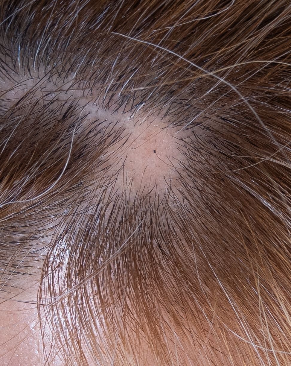 Caso contrario cuando se trata de una alopecia Areata que solo se disimula dejándolo largo para peinar encima de la zona alopécica o rapándose la cabeza con rastrillo.